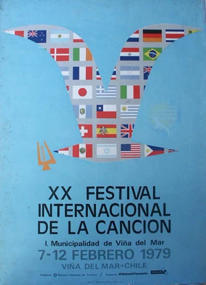 By 1979, the harp became orange and the Gaviota symbol was filled with the flags of many countries, with Chile (where Viña del Mar is located) at the center.