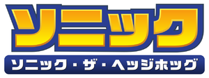 On July 13, 2002, a new logo was first seen at the 16th Next Generation World Hobby Fair event in Japan.[11][12] It was now written in katakana with yellow ソニック having pronounced gradient and blue outlines. Underneath it was full title ソニック・ザ・ヘッジホッグ on a blue banner with rounded corners.